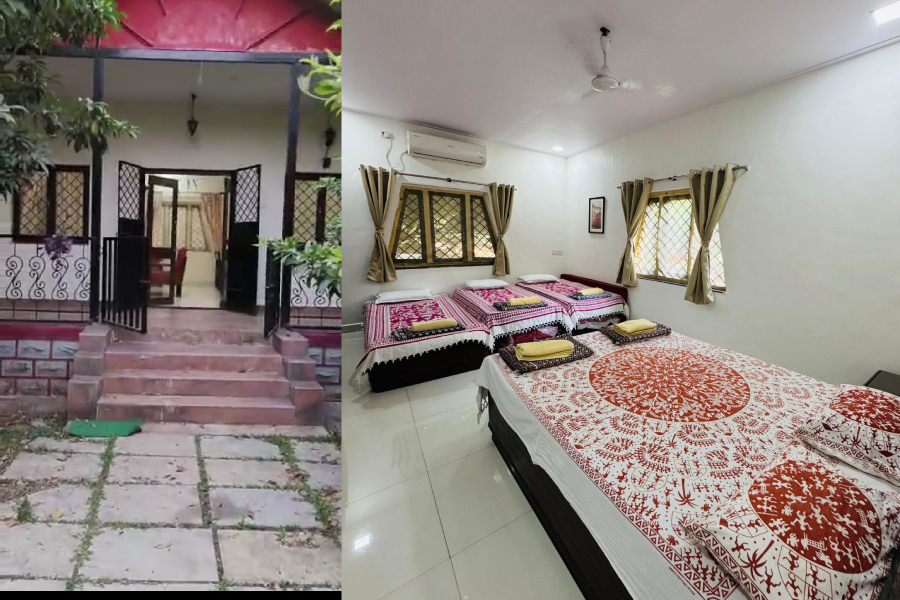 Villa1 has a beautiful and spacious living room along with a bedroom (with AC). The villa will be equipped with clean rooms, 2 bathrooms and verandahs at the front and the back. Three single beds and two double beds are available. With these facilities the Villa becomes the best option if you want to stay here with a small group of friends or family.